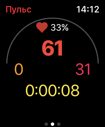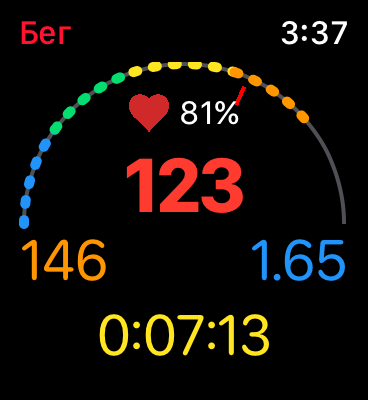 На экране часов при этом выводится "спидометр" пульса с цветовой разметкой пульсовых зон, максимальны и текущий пульс, калории, дистанция или вариабельность в зависимости от вида тренировки.