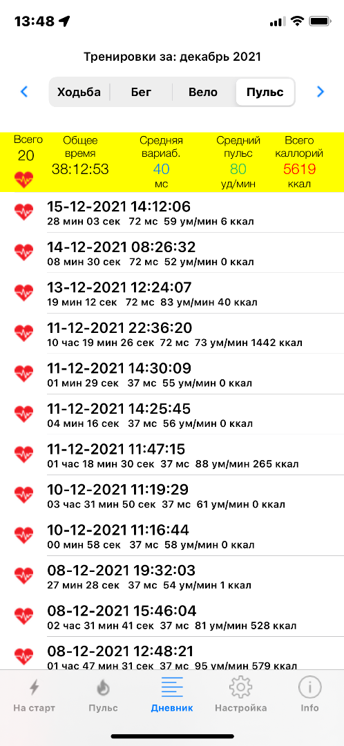 Так отображается ход тренировок для других видов – силовых или связанных с перемещением в ограниченном пространстве (теннис, волейбол, футбол, тренажеры, плавание в бассейне и других) где контроль и расчет сжигания калорий осуществляется по пульсу.