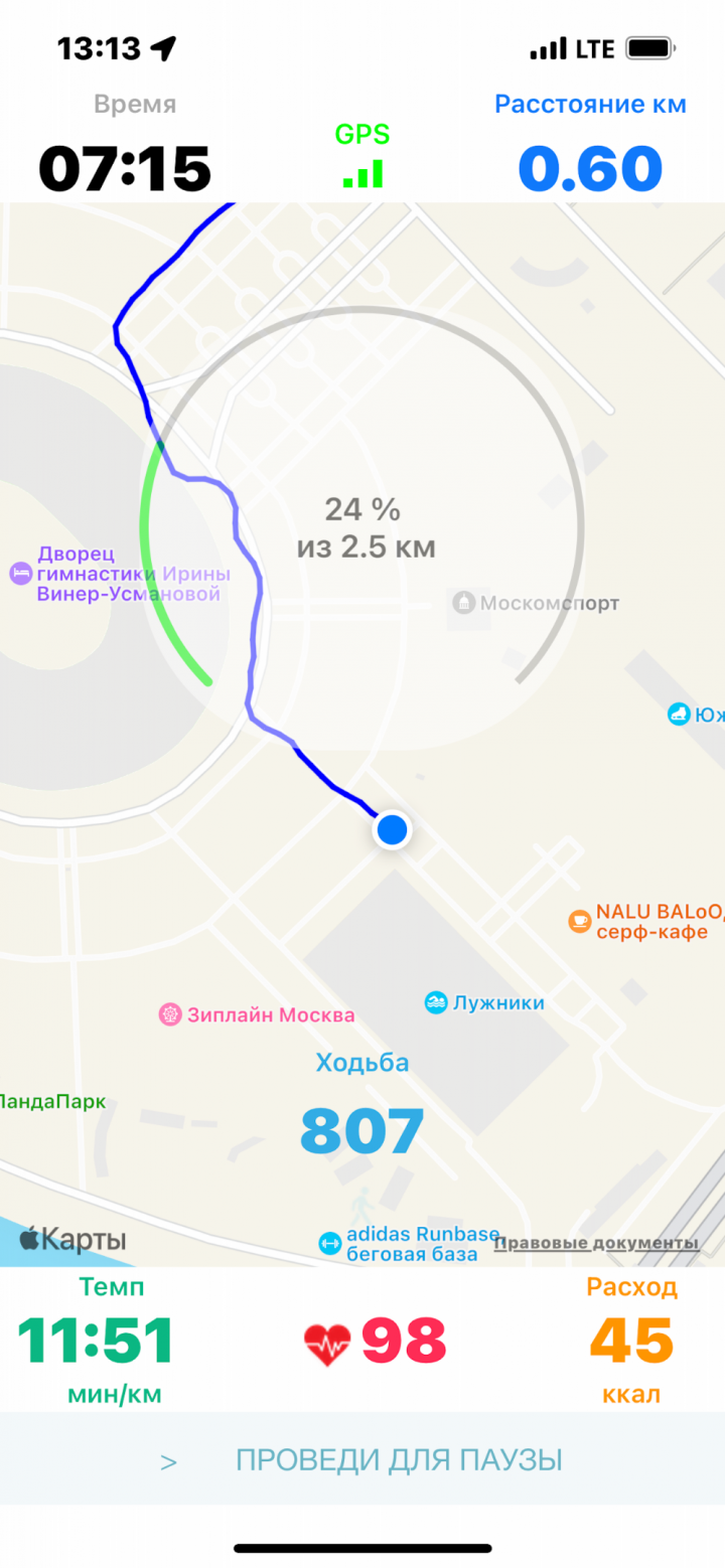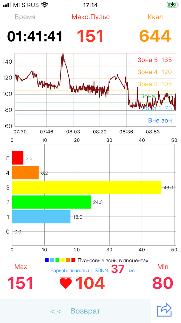 При этом на экран iPhone в реальном времени выводятся графики изменения пульса по зонам, гистограмма времени пребывания в каждой из зон в процентах, данные текущей вариабельности сердечного ритма по SDNN.