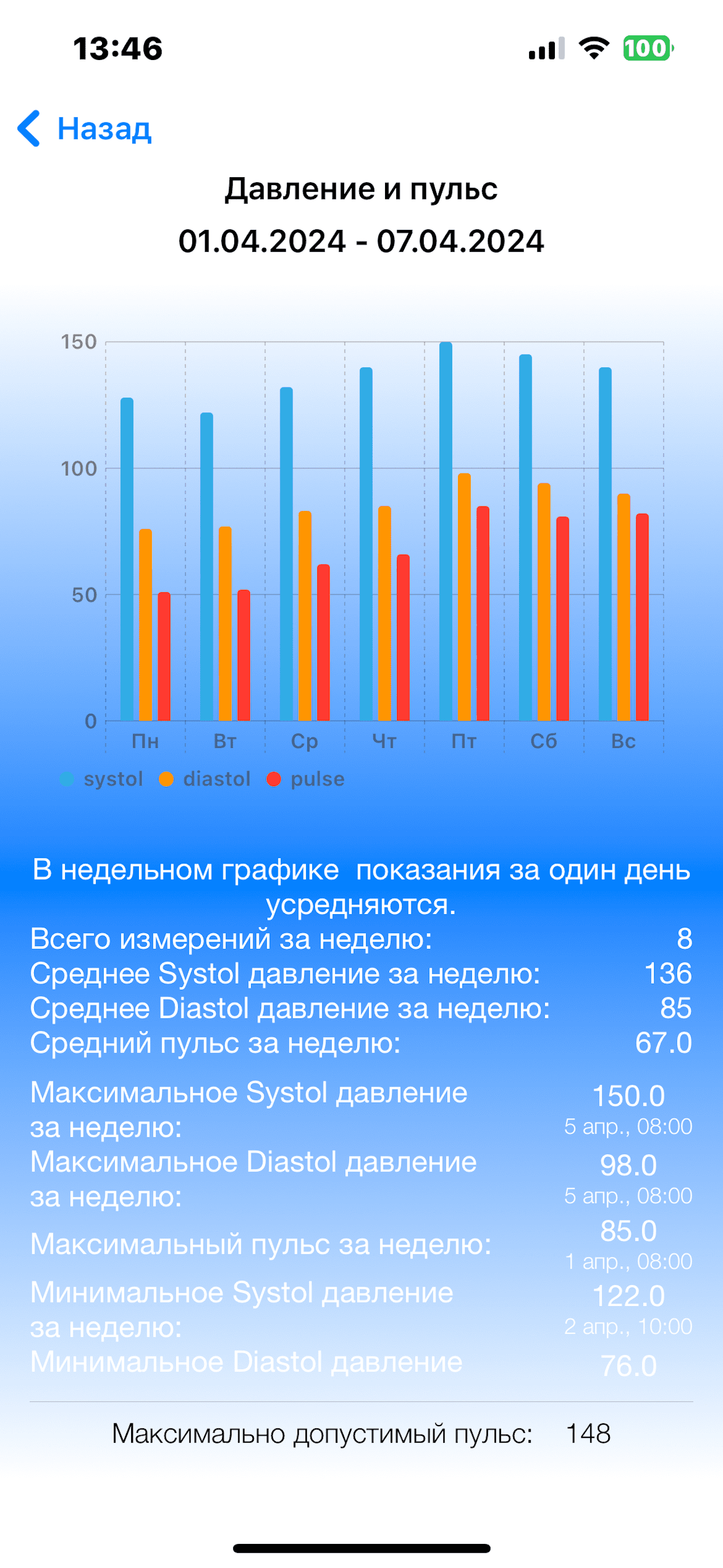 Приложение позволяет обобщать введенные данные и получать статистику по любому показателю за день, неделю, месяц, год или за весь период наблюдения в цифровом или графическом виде с целью дальнейшего анализа и сравнения результатов.