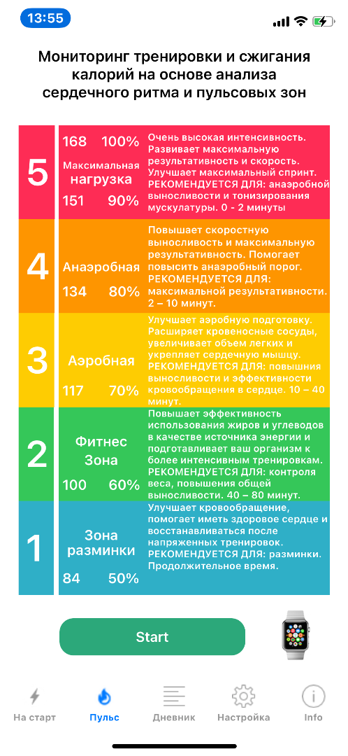 Приложение рассчитывает максимально допустимый пульс и соответственно пульсовые зоны, позволяя регулировать физическую активность в нужной пульсовой зоне.